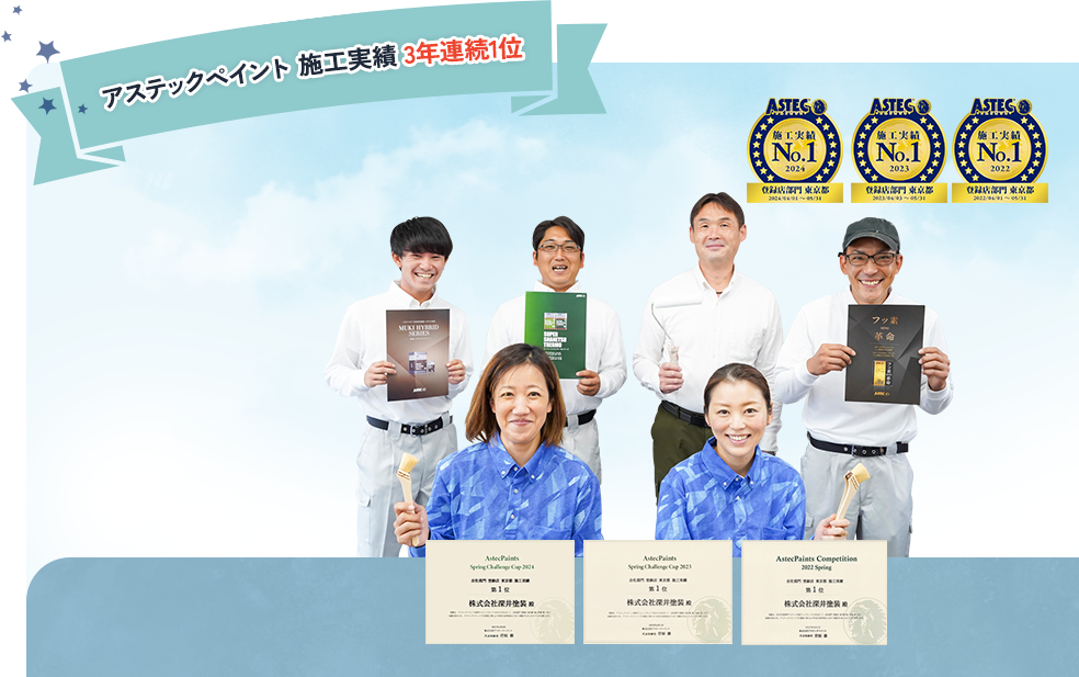 老舗塗料メーカー「アステックペイント」の塗料を採用し、数多くの施工実績を積み重ねてきた結果、「アステックペイント 施工実績No.1」を受賞しています。