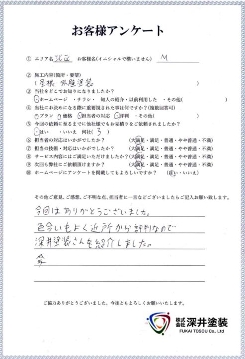 スタッフの丁寧な対応は、地域住民の皆様に大変評価いただいております。我々は強引な営業は一切いたしません。見積価格を提出して終わりではなく、必ず塗装に関してご理解とご納得いただいた上で工事を進めます。これからも深井塗装をよろしくお願いいたします。