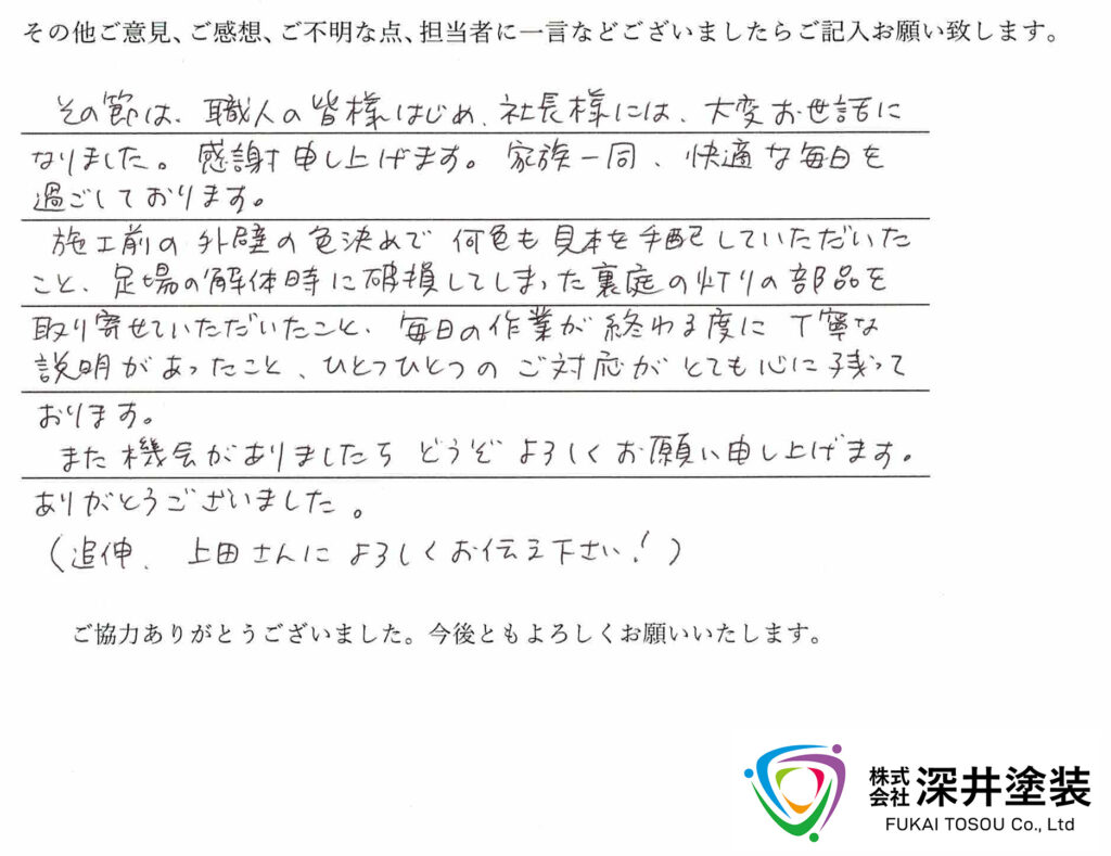 その節は職人の皆棒はじめ、社長様には大変お世話になりました。感謝申し上げます。